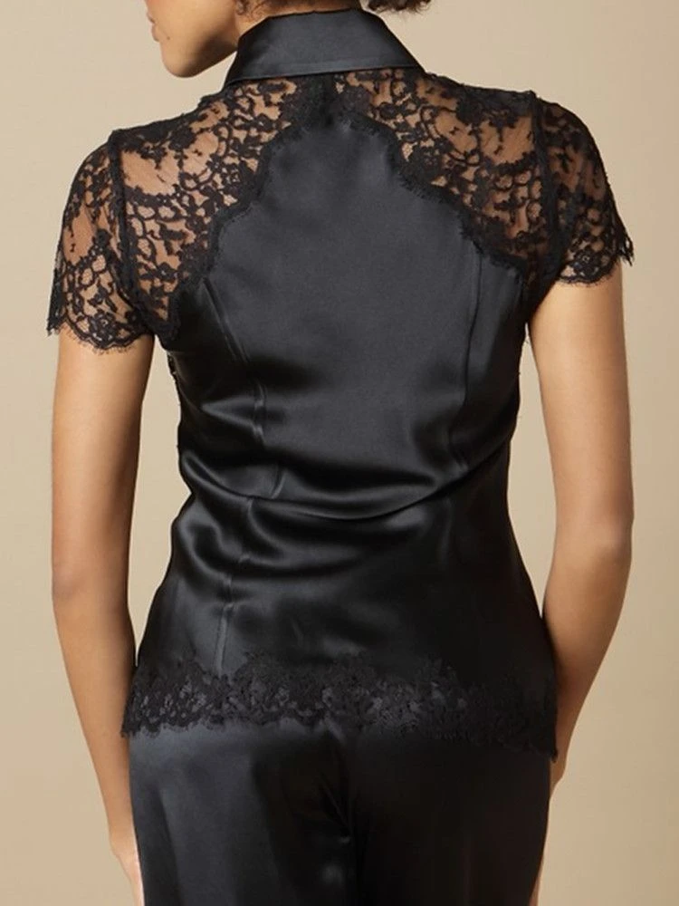 Die florale französische Spitze wurde im oberen Bereich am Decolleté und seitlich verarbeitet, wodurch dieses Oberteil teiltransparent ist. An der Brust ist die Spitze mit Einsätzen aus Seidensatin hinterlegt und daher blickdicht. Diese Kurzarm-Seidenbluse ist ca. 68 cm lang, hat kurze Ärmel und einen doppelt gearbeiteten Kragen mit einer dekorativen Seidenschleife.