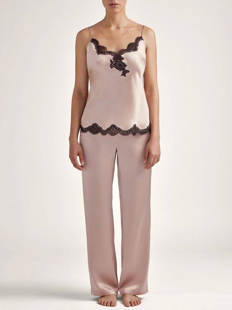 Die Hose mit langen Beinen hat seitliche Taschen und kann als Nachtwäsche getragen werden. Die feine Seidenhose ist auch als Homewear oder für einen eleganten Abendlook kombinierbar.