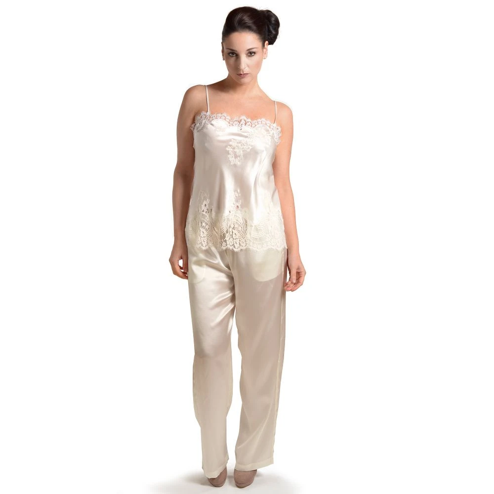 Die französische Spitze wurde in besonders aufwendiger Handarbeit als inkrustierte Spitze in den Satin aus reiner Seide eingearbeitet. Am unteren Saum ist die Spitze umlaufend gearbeitet. Die Büste ist mit der edlen Spitze benäht und blickdicht. Dieses mit ca. 75 cm etwas länger geschnittene Seidentop ist in Kombination mit der separat erhältlichen Pyjamahose als Nachtwäsche kombinierbar oder kann auch einzeln als raffinierte Oberbekleidung getragen werden.