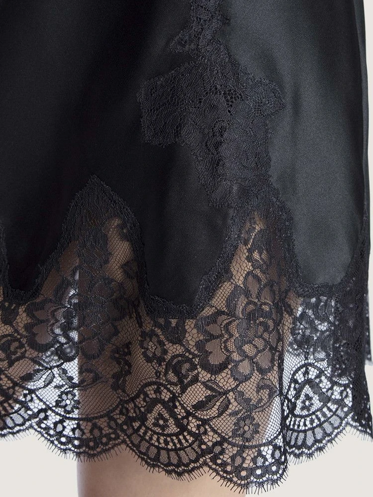 Das Negligé ist am Decolleté und zusätzlich am Saum umlaufend mit der weichen Spitze benäht. Durch die feine Verarbeitung und den körpernahen Schnitt ist dieses Modell auch als Unterkleid tragbar.