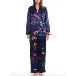 Dieser Seidenschlafanzug ist in den Größen S bis XL erhältlich (entspricht etwa den deutschen Damengrößen 36 bis 42). Das Oberteil ist geknöpft und hat lange Ärmel.