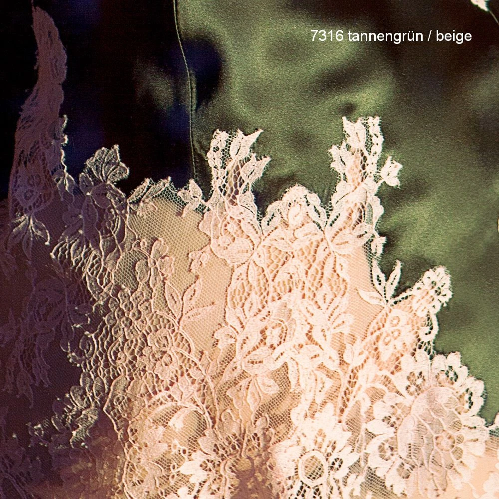 Die exquisite Spitze wurde am Decolleté auf die edle Seite appliziert. Dieses Seidentop ist ca. 60 cm lang und hat verstellbare Spaghetti-Träger. Durch die feine Verarbeitung ist dieses Seidentop als Unterziehshirt oder auch als festliches Top, z.B. unter einem Blazer verwendbar.