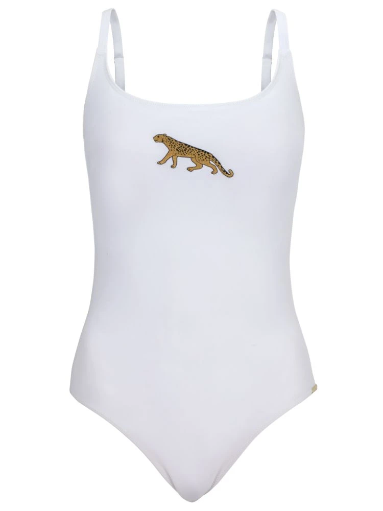 Der Badeanzug Panther von Fürstenberg ist zeitlose Basic-Bademode, welche in vielen Größen erhältlich ist. Die ausgeformten B-Cups sind leicht gepolstert. Unter der Büste ist ein stützender Gummizug eingenäht. Das Decolleté wird von einer sandfarbenen Stickerei eines Panthers geschmückt. Die Träger sind in der Länge verstellbar.