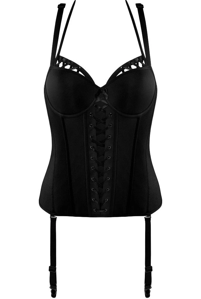 Das Straps-Korsett hat ausgeformte, gefütterte Halbschalen-Cups in Balconette-Form. Die Schalen mit Bügel sind auf der Außenseite komplett glatt und am oberen Rand mit einer Schnürung verziert, die in ein Neckholder-Bändchen übergeht. Dieses Korsett hat auf der Vorder- und Rückseite Schnür-Look Elemente (festgenäht, nicht zu schnüren). Der Verschluss ist hinten seitlich als Häkchenverschluss ausgeführt. Die breiten Träger sind elastisch, in der Länge verstellbar und werden auf dem Rücken mittig zusammengeführt und mit einem raffinierten Schnürelement geschmückt. Das elastische Korsett hat unten 4 in der Länge verstellbare Strapsbänder, die abnehmbar sind.