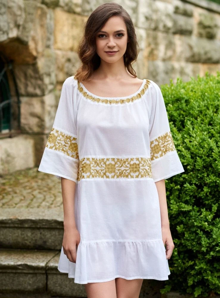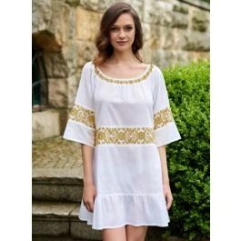 Sie hat mittellange Ärmel und ist nicht gefüttert. Breite Bordüren mit floralen goldenen Bestickungen sind im Oberteil und in den Ärmeln eingenäht. Am Saum ist ein wellig genähter Rüschenabschluss und der elastische Kragen kann auf unterschiedliche Art getragen werden. Der zeitlose Schnitt und die bequeme Passform machen aus dieser Tunika einen gemütlichen Begleiter für zu Hause oder auf Reisen. Da das Material sehr fein ist, ist diese Tunika leicht durchscheinend.