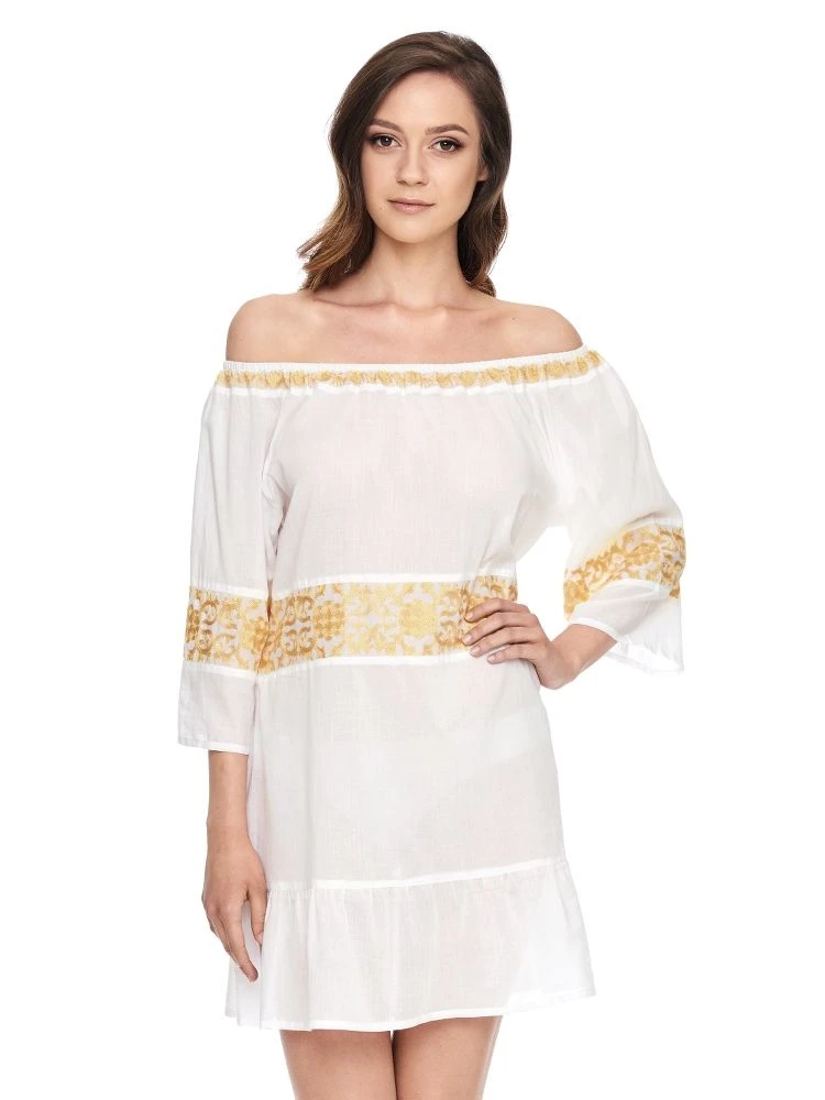 Jördis ist eine verführerische Kollektion aus einem zarten Baumwollbatist mit ornamentalen, goldenen Stickereien. Das feine Material ist zart und sommerlich und daher genau richtig für luftige Sommerkleidung. Diese Kollektion verführt mit ihren femininen Schnitten und der hochwertigen Bestickung.