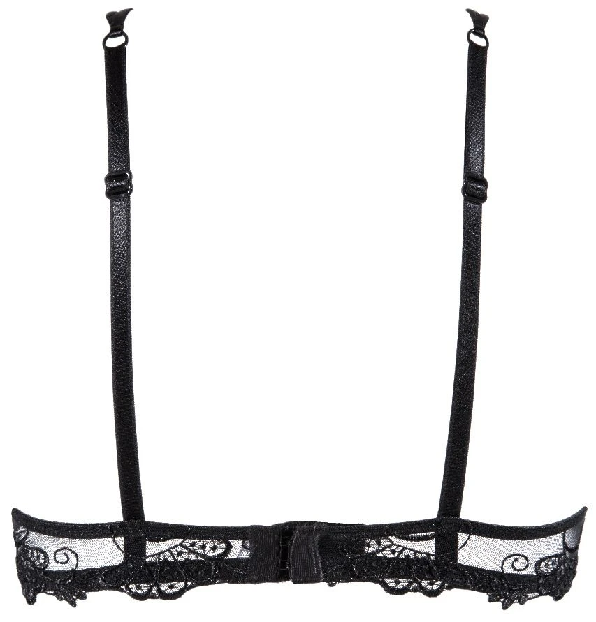 Der BH besteht vorne, sowie an den Seiten aus Tüll, wobei der Tüll vorne an den Cups super fein und daher transparent ist. In Kombination mit der Stickerei wird so ein leichter Tattooeffekt auf der Haut erzeugt. Die Cups in Halbschalenform sind unwattiert und haben Bügel. Zarte Stickereien umspielen die Cups und komplimentieren die Brust. Vorne am Mittelsteg wird das Dekolleté mit einem kleinen Strasselement geziert. Die Träger aus Satin sind längenverstellbar und ebenfalls mit einer kleinen Stickerei versehen. Dieses detailreiche Zusammenspiel der unterschiedlichen Materialien und Akzente formt sich zu einer aufregenden Basickollektion.