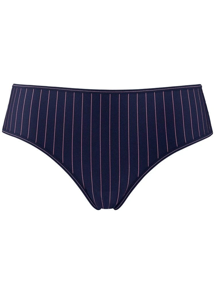 Der Slip in knapper Brasiliana Form besteht aus feinem, sehr weichen Jersey mit fuchsia-pinkem Nadelstreifen-Muster. Er ist seitlich ca. 8 cm hoch, hat elastische Abschlüsse, hinten eine Mittelnaht und einen Innenzwickel aus Baumwolljersey.