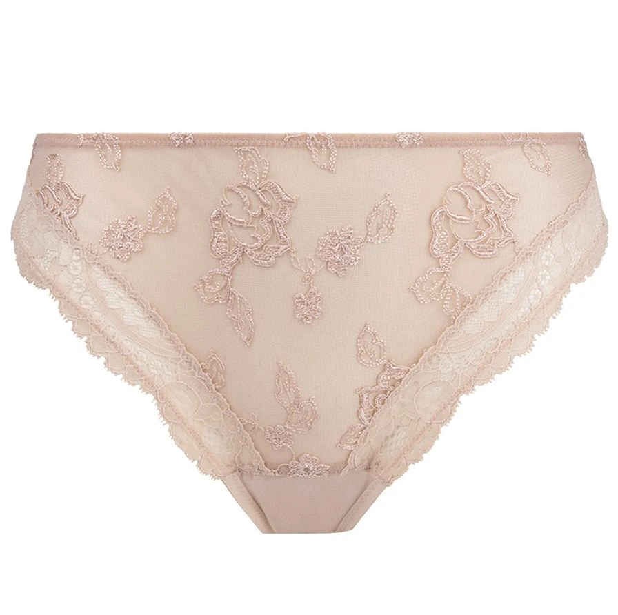 Der Slip ist vorne aus feinem bestickten Tüll, welcher leicht transparent ist. Vorne an den Rändern ist die feine Leavers-Spitze eingesetzt. Hinten ist der edle Slip aus super weichem, blickdichtem Jersey. So wird ein aufregender Mix unterschiedlichster Materialien erzeugt. Der Schritt hat innen einen weichen Baumwollzwickel. Dieses detailreiche Zusammenspiel der unterschiedlichen Akzente formt sich zu einem raffinierten Wäscheslip. Aus dieser zarten Kollektion gibt es weitere ergänzende Kombinationsteile seperat in unserem Shop.