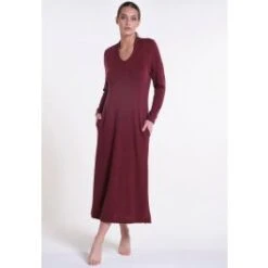 Das Lounge-Kleid hat lange Ärmel und ist ca. 125 cm lang. Es ist eine wärmende Loungewear für jede Jahreszeit kann aber auch als Tagbekleidung in verschiedenen Kombinationen getragen werden. Es ist bei uns in der Farbe Bordeaux Rot erhältlich.