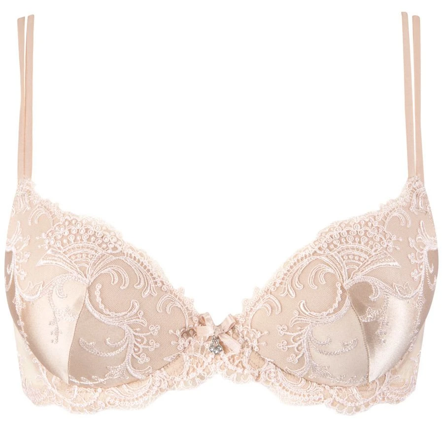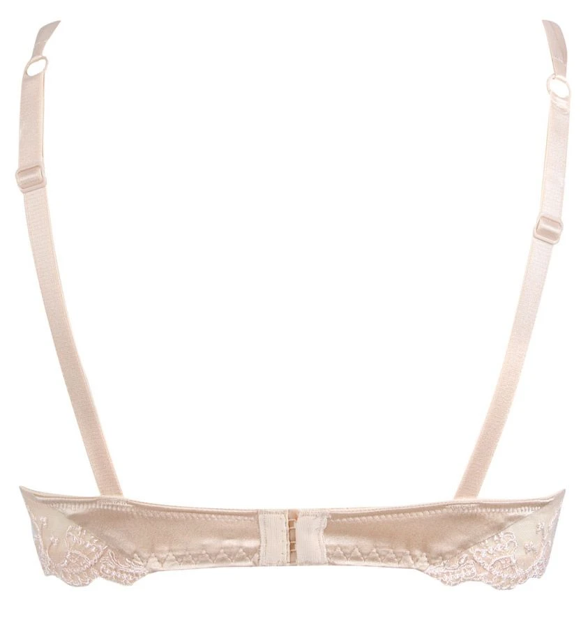 Der bezaubernde BH hat wattierte 3/4 Schalen mit Bügeln. Da die Cups gefüttert sind sorgen sie für ein angenehmes und sicheres Tragegefühl. Die Cups sind aussen größtenteils aus der feinen Seide. Der Rand der Cups ist aus dem feinen Tüll, welcher mit hochwertigen Stickereien versehen ist. Vorne am Mittelsteg ziert eine kleine Schleife mit Zierstrassstein den zauberhaften BH. Hinten und an den Seiten besteht der BH aus dem bestickten Tüll, wobei hinten ein kleiner Seideneinsatz eingefügt wurde, um den BH abzurunden. Die verstellbaren Träger aus Satin sind vorne doppelläufig und hinten längenverstellbar. Dieses edle Zusammenspiel der unterschiedlichen Materialien und Akzente formt sich zu einem unwiederstehlichen Bügel BH, der sowohl für den Alltag als auch für besondere Anlässe perfekt geeignet ist. Aus dieser zarten Kollektion gibt es weitere, ergänzende Kombinationsteile seperat in unserem Shop.