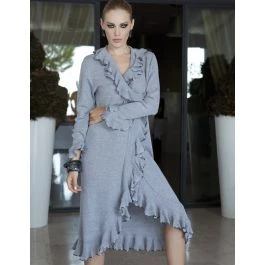 Das Grundmaterial für den Hausmantel Marisa ist ein leichter Feinstrick aus der kostbaren Wolle vom Merino-Schaf und Kaschmir. Erhältlich ist er in cremigen Sahne oder zeitlosem Grau. Der kurze Mantel hat lange Ärmel und ist etwa knielang. Dieses Modell ist in den Größen 34 – 42 (deutsche Größen) erhältlich.