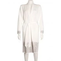 Dieser Hausmantel ist aktuell in den Farben wollweiß mit beige oder in grau und in 36 bis 44 (deutsche Größen) erhältlich (entspricht den Herstellergrößen S bis XXL).