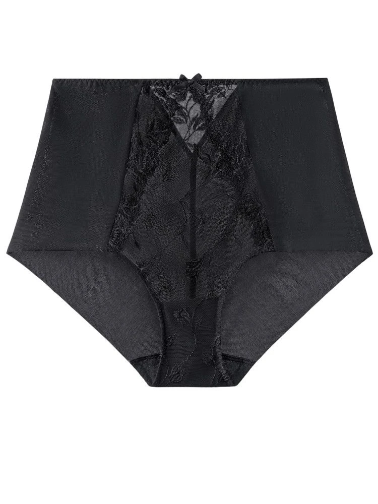 Der hohe Taillenslip ist aus Tüll und bestickter Tüllspitze gefertigt. Der Tüll ist seitlich und hinten in Futteralverarbeitung verwendet für besonders flache Kanten. Der Slip ist semitransparent und hat einen Innenzwickel aus Baumwolljersey.