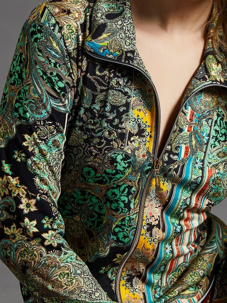 Ausgefallener Hausanzug Chateau de Versailles mit langen Ärmeln aus weichem Viscose Jersey. Dieser modische Hausanzug ist aus bedrucktem, elastischen Viscose Jersey gefertigt und kann als Haus- oder Freizeitanzug getragen werden. Das Oberteil ist eine Jacke mit Reißverschluss und seitlichen Taschen mit einer Länge von ca. 62 cm. Die kurze Jacke hat elastische Bündchen und ist kombiniert mit einer gleichfarbigen Leggings mit Gummizugbund.