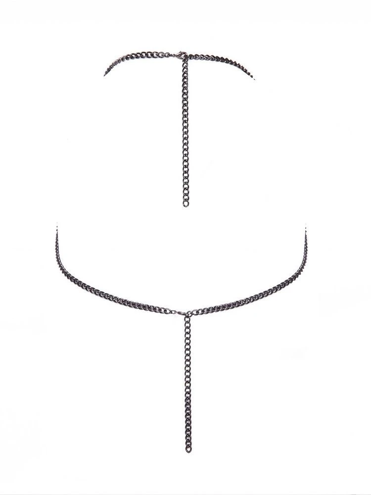 Dieser BH ist komplett aus metallischen Kettengliedern gefertigt, die im Vorderteil mit Strasskristallen besetzt sind. Der BH wird im Nacken und auf der Rückseite mit der verstellbaren Kette auf die gewünschte Größe eingehakt (onesize).