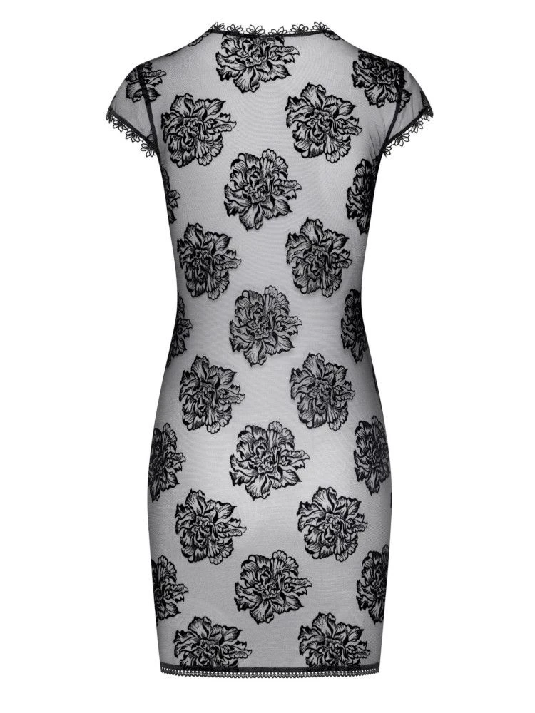 Das kurze, schwarze Lingerie Kleid von Cadolle ist ein eleganter Hauch von Nichts… Es besteht aus transparentem, schwarzem Tüll, welcher mit einem Flock-Velour Blumenmuster bedruckt ist. Das Kleidchen ist ungefüttert und daher transparent. Es hat kurze Ärmel und Spitzenverzierungen am Ausschnitt.