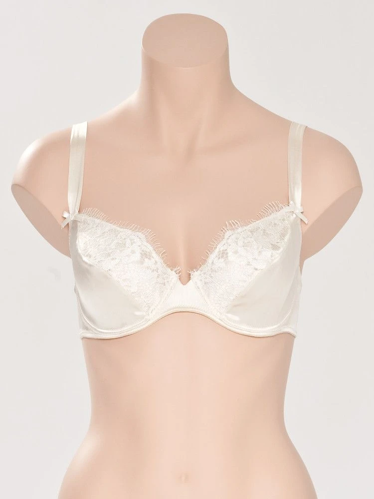 Der Seiden-BH ist unwattiert, mit Bügel ausgestattet und hat eine gute Passform. Die angenehm breiten, außen angesetzten Träger aus Seidensatin sind hinten verstellbar und elastisch. Die Spitzenauflage auf den Cups unterstreicht die besondere Hochwertigkeit dieses Seiden BHs. Ein separat erhältlicher Slip aus der gleichen Kollektion ergänzt diese Seiden- Unterwäsche optimal.