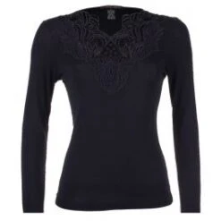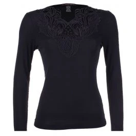 Das Langarm Shirt Wolle-Seide besteht aus einem besonders hochwertigen glatten Jersey aus 70% extrafeiner Merinowolle und 30% Seide in Kombination mit einer besonders hochwertigen Makramee Spitze von der schweizer Marke Bischoff aus St. Gallen. Dieses edle Shirt hat lange Ärmel, eine Gesamtlänge von ca. 60 cm und einen V-Ausschnitt mit Spitzenbesatz.
