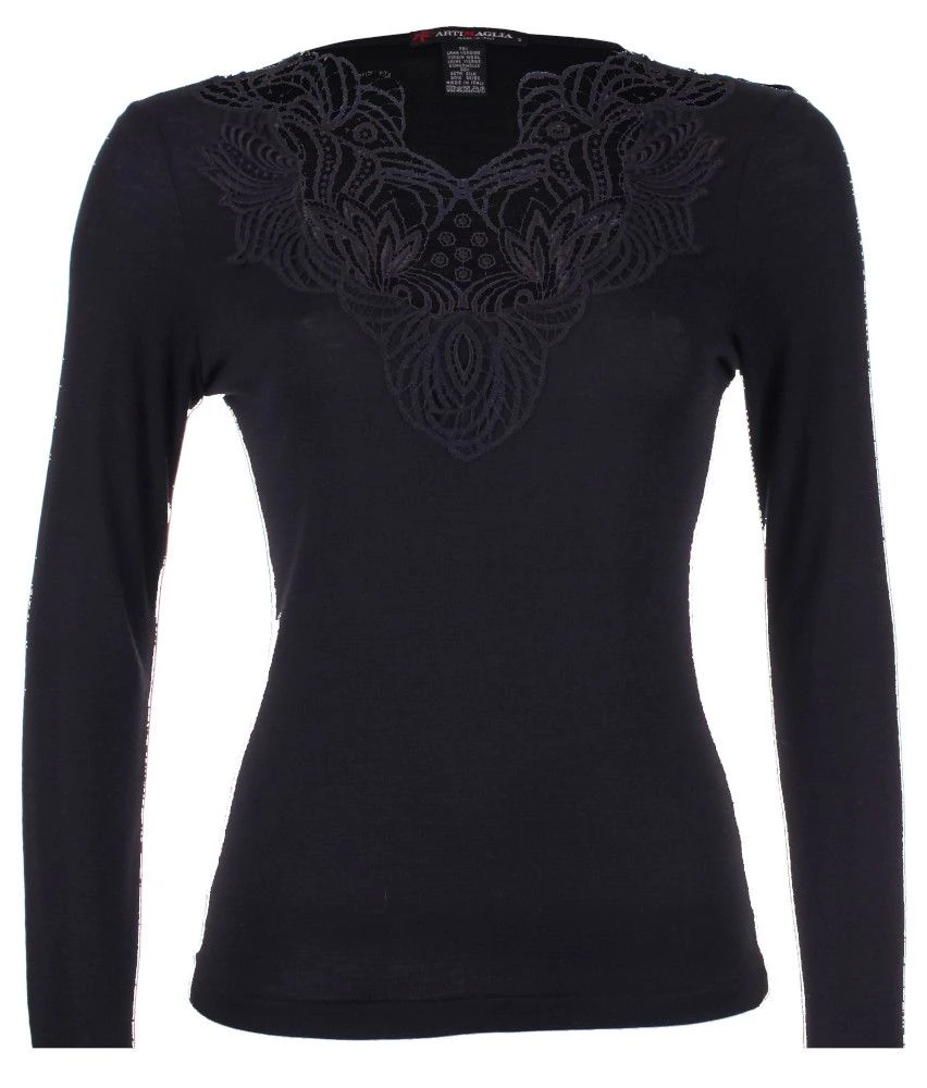 Das Langarm Shirt Wolle-Seide besteht aus einem besonders hochwertigen glatten Jersey aus 70% extrafeiner Merinowolle und 30% Seide in Kombination mit einer besonders hochwertigen Makramee Spitze von der schweizer Marke Bischoff aus St. Gallen. Dieses edle Shirt hat lange Ärmel, eine Gesamtlänge von ca. 60 cm und einen V-Ausschnitt mit Spitzenbesatz.