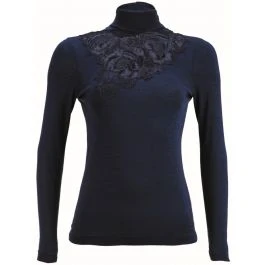 Das Rollkragen Shirt Wolle-Seide besteht aus einem besonders hochwertigen Jersey aus 70% extrafeiner Merinowolle und 30% Seide in Kombination mit einer luxuriösen, schweizer Spitze. Dieses edle Rollkragenshirt hat lange Ärmel, eine Gesamtlänge von ca. 60 cm und einen Rollkragen. Das Decolleté ist mit Blüten-Spitze gestaltet.