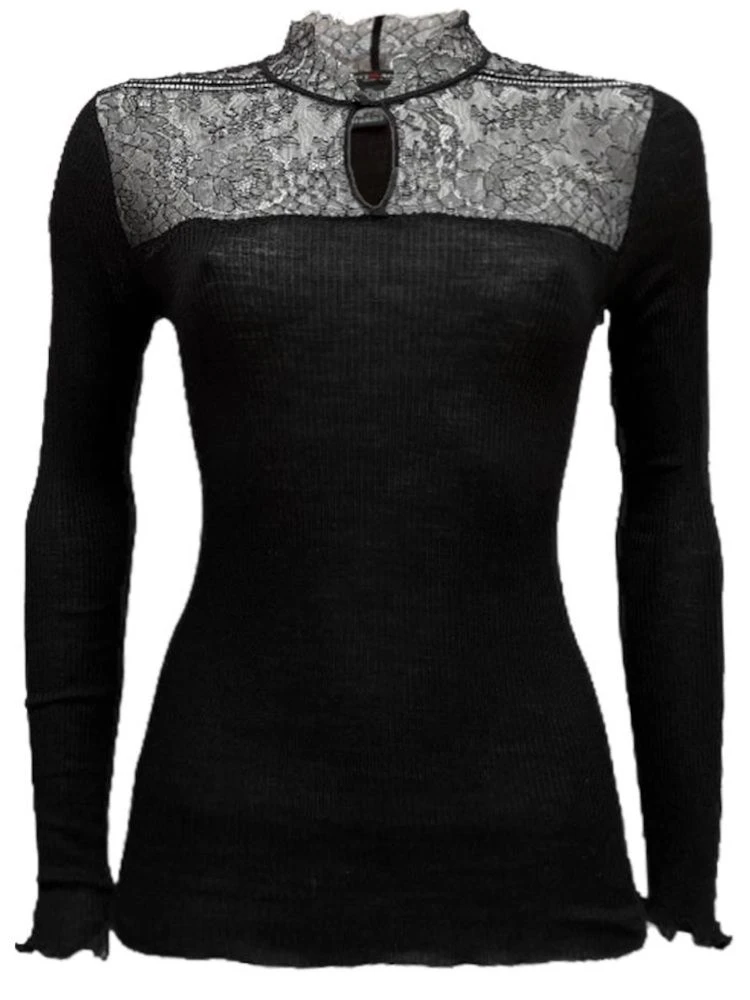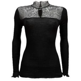 Das Stehkragen Shirt Wolle-Seide besteht aus einem besonders hochwertigen geripptem Jersey aus 70% extrafeiner Merinowolle und 30% Seide in Kombination mit einer exklusiven französischen Caudry Spitze. Dieses edle Shirt hat lange Ärmel, eine Gesamtlänge von ca. 60 cm und einen Stehkragen aus Spitze. Das Decolleté ist ebenfalls mit Blüten-Spitze gestaltet. Der Kragen wird vorne mit einem zierlichen Knöpfchen geschlossen.