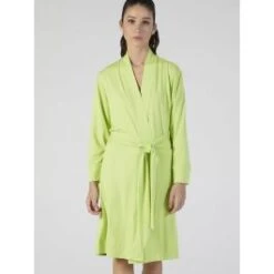 Der Morgenmantel Basic hat lange Ärmel. Er wird gewickelt getragen und mit einem Bindegürtel geschlossen. Er hat eine zeitlos elegante, klassische Form und ist in verschiedenen Längen und in den Farben kiwigrün, schwarz oder koralle pink erhältlich.