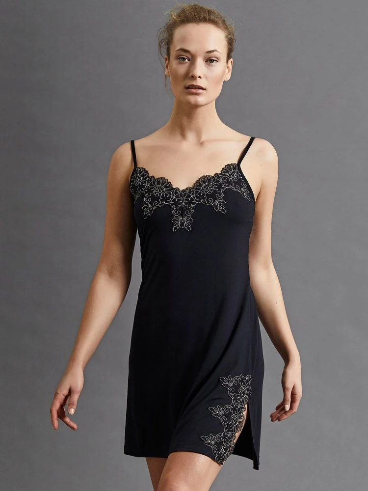 Das kurze Spaghettiträger Nachthemd von Fürstenberg besteht aus hautschmeichelndem, weichen Modal in einer elastischen Jersey-Qualität (93% Modal, 7% Elasthan). Es ist ca. 95 cm lang und in den Größen 36 bis 42 erhältlich. Das weiche Nachthemd hat verstellbare Träger, einen seitlichen Schlitz am Saum und das Dekolleté ist mit bestickter Tüllspitze verziert.