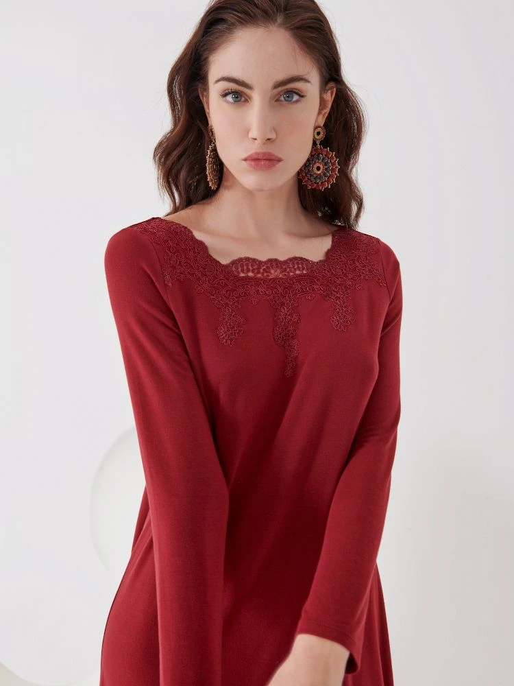 Das Nachtkleid hat lange Ärmel und einen halsnahen Ausschnitt mit, welcher mit einer edlen floralen Spitze verziert ist. Die Gesamtlänge dieses attraktiven Nachthemdes ist 100 cm.