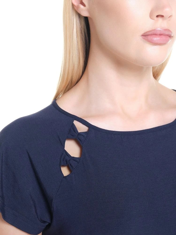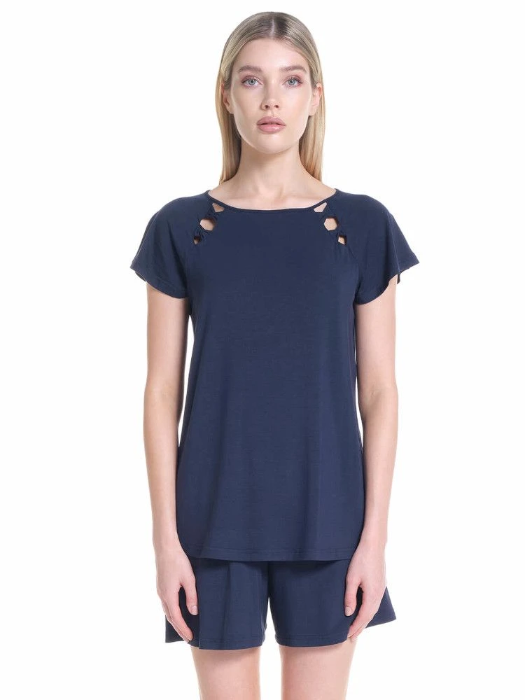 Der Kurzarm-Pyjama von Verdiani Weekend besteht aus super-weichem Micro-Modal in einer hautsympathischen, elastischen Jersey-Qualität (92% Modal, 8% Elasthan). Für diese Kollektion wird ein besonders hochwertiger Lenzing Tencel® Markenmodal aus österreichischer Produktion verwendet. Der sommerliche Pyjama ist Made in Italy und in den Größen 36 bis 42 erhältlich. Der Damen Kurz-Schlafanzug hat kurze Ärmel und einen runden Ausschnitt. Das Oberteil ist mit Cut-Outs mit Schleifchen-Details gestaltet und ca. 68 cm lang und die kurze Hose hat einen Gummibund.