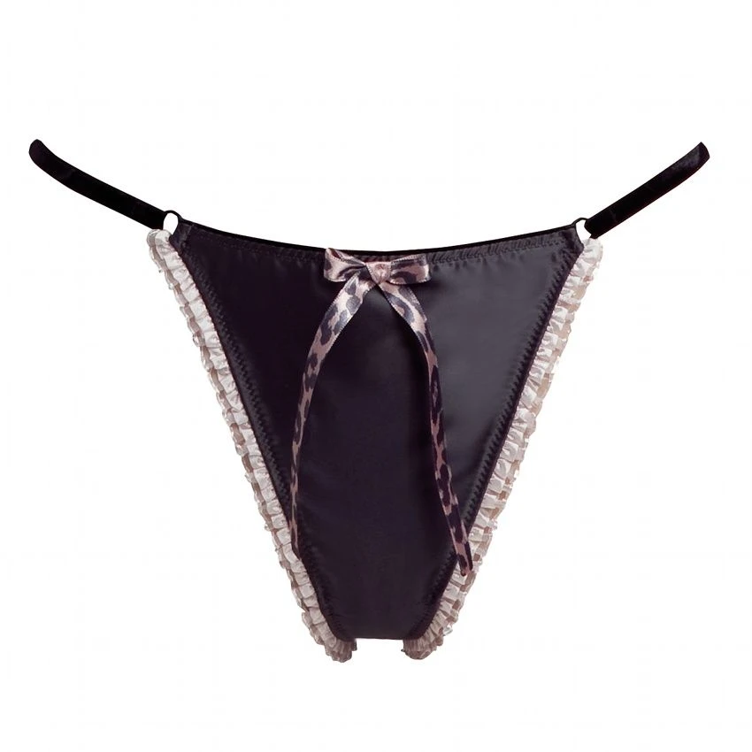 Dieser String besteht aus antrazith-farbenem, leicht glänzendem Stretch-Satin. Die Beinabschlüsse sind mit zart-rosé farbenen Rüschen eingefasst. Den Bund ziert ein kleiner goldener Anhänger des Diamor-Logos und eine Schleife aus rosa Leopard-Print Satin.