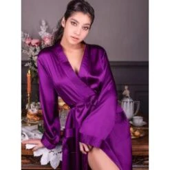 Dieser lange Seiden-Morgenmantel wird in den Größen 34 bis 46 angeboten (deutsche Damengrößen) und ist in den Farben puder-rosé, jeansblau oder pflaumen-violett erhältlich.