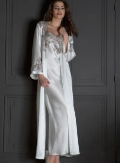 Dieses verführerische kurze Seiden-Nachthemd ist aus hochwertigem, weißem oder schwarzem Stretch-Seidensatin (95% Seide, 5% Elasthan) gefertigt. Das knielange Nachthemd (Länge ca. 95 cm) ist oben und unten umlaufend mit einem breiten Besatz von floraler Eye-Lash Spitze besetzt. Das Grundmaterial für das kurze Seidenneglige Mailin ist Stretchseide, die zur Verbesserung der Passform einen Elasthan Anteil hat.