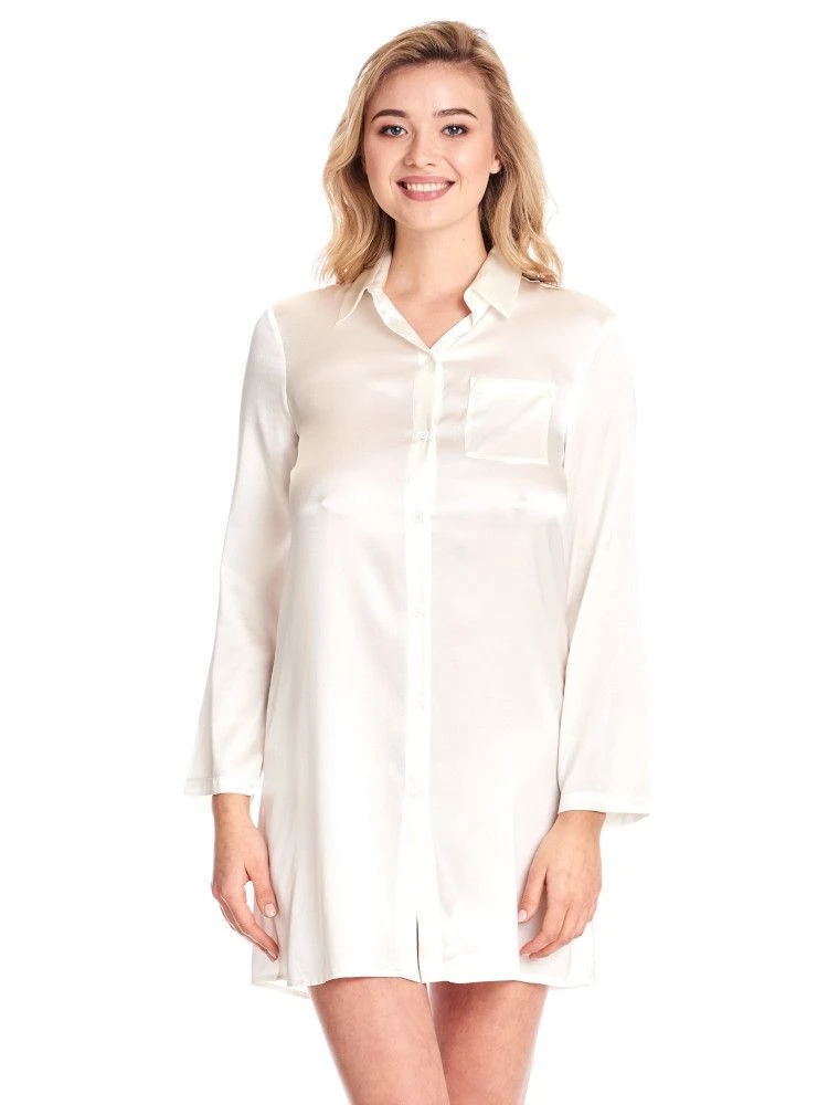 Das Sleepshirt mit langen Ärmeln aus der verführerischen Serie von Gattina besteht aus fein glänzendem Stretch-Seidensatin. Es ist erhältlich in klassischen Uni-Farben, jeweils in den Größen 36 bis 48 (deutsche Damenkonfektionsgrößen). Auf der Vorderseite ist es durchgehend geknöpft und kann hochgeschlossen werden. Es hat lange Ärmel und eine Gesamtlänge von ca. 90 cm mit einem rundgeschnittenen Saum. Der klassische Schnitt und die bequeme Passform machen aus diesem Sleepshirt ein Nachthemd für das ganze Jahr.