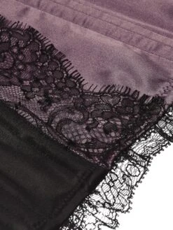 Das kurze Taillenkorsett Raja Soie Tourbe von Cadolle ist eine luxuriöse Wäsche aus kräftigem Satin, welche mit echter Seide und feiner Spitze verziert ist. Das ca. 20 cm hohe Korsett besteht aus innen abgefüttertem Satin. Es hat einen seitlichen Reißverschluss, umlaufend alle paar cm eingearbeitete Stäbchen und wird auf der Rückseite über die gesamte Länge geschnürt. Die Farbe ist ein rauchiges Violett kombiniert mit schwarz (die violetten Parts sind aus Seidensatin gefertigt).