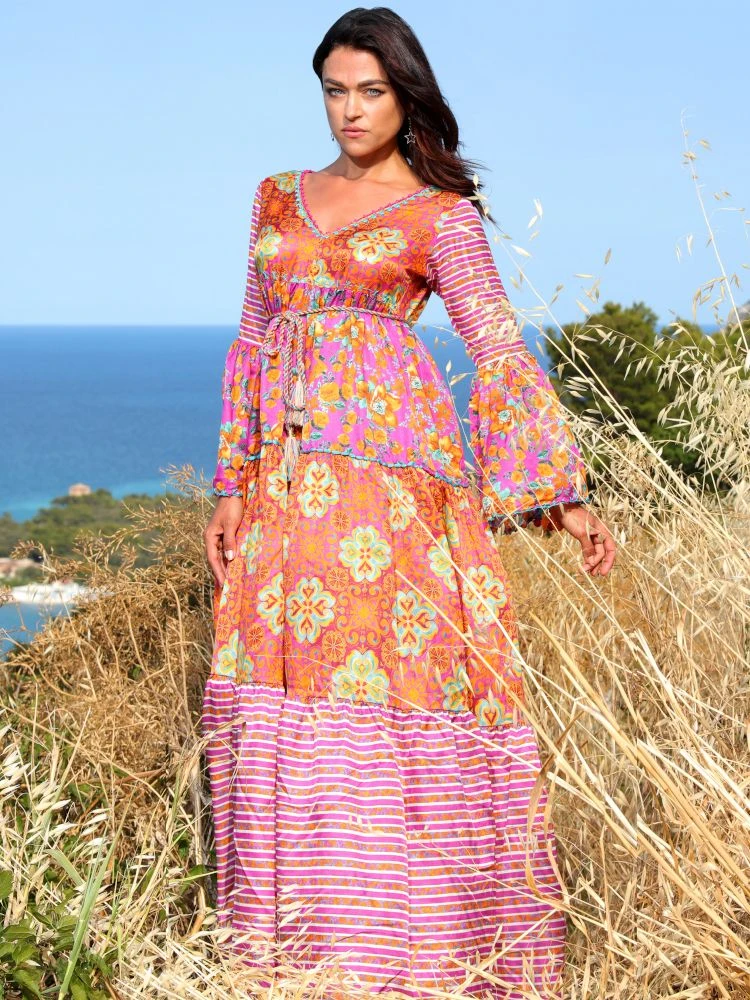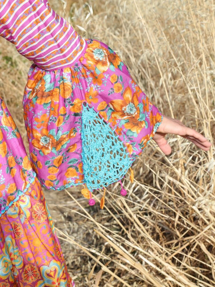 Das lange Strandkleid Narciso Lilla der italienischen Luxus-Marke Laetitia Beachwear ist aus feinem Seidenbatist (65% Baumwolle, 35 % Seide) gefertigt. Das exklusive Kleid ist in einem Mustermix mit floralen und graphischen Mustern gearbeitet und in echter Handarbeit mit Häkelsäumen verziert. Der Ausschnitt und die weiten Ärmelenden haben einen Häkelrand mit eingearbeiteten Zierperlen. Außerdem haben die Ärmelenden Einsätze aus gehäkelter Spitze in der Farbe türkis.