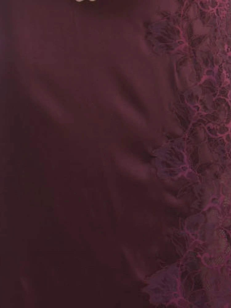 Diese aufwendig verarbeitete Seidenwäsche kann als elegante Abendkleidung (z.B. als längeres Top zu Hosen) getragen werden. Die hochwertige Spitze wurde im vorderen Saum und am Decolleté aufgesetzt. Dieses Seidennegligé ist im oberen Bereich blickdicht.