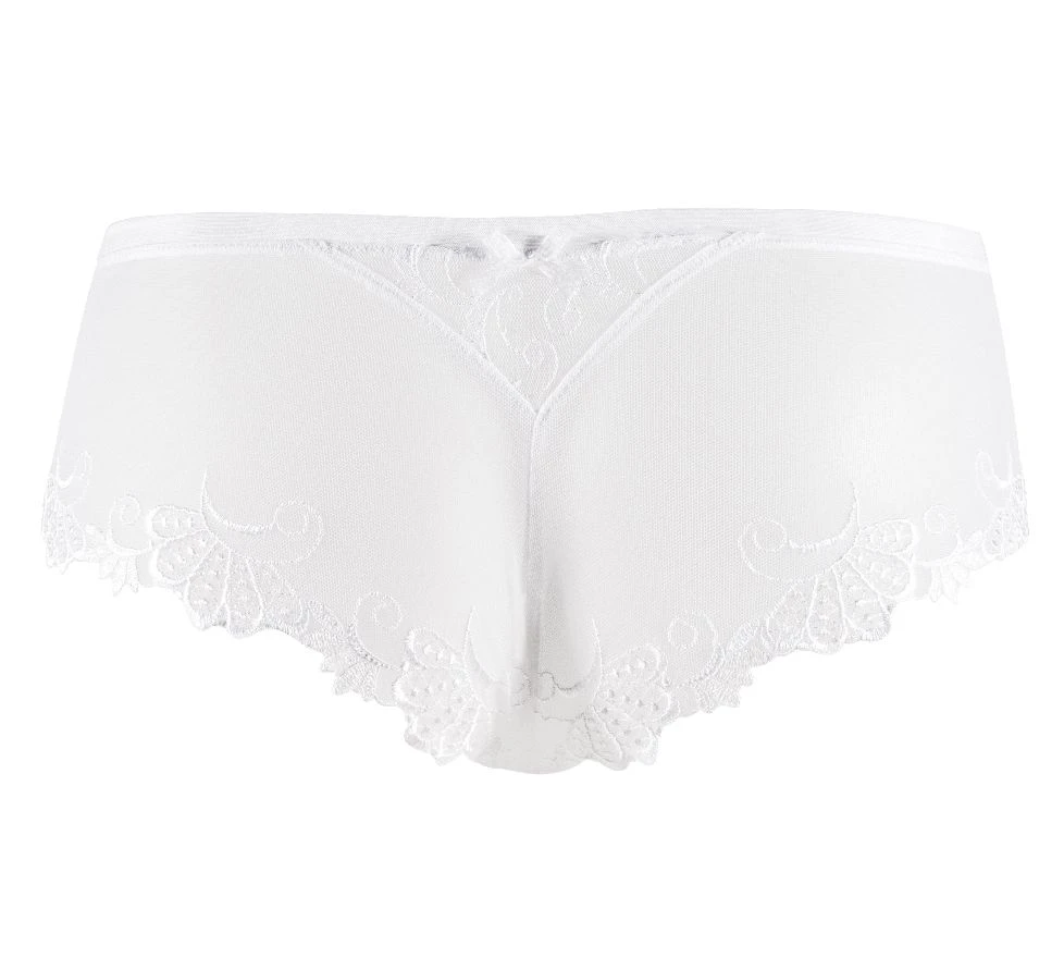 Der Slip ist komplett aus teiltransparentem Tüll, verziert mit floralen Guipure-Stickereien. An den Seiten ist der Slip mit super feinem Tüll versehen, welcher in Kombination mit den zarten Stickereien einen leichten Tatttooeffekt erzeugt. Die Hinterseite des Pantys ist komplett aus transparentem Tüll, welcher nur an den Seiten mit den feinen Stickereien versehen ist. Zusätzlich schmückt ein kleines Zierschleifchen die Rückseite. Im Schritt hat der raffinierte Slip einen weichen Baumwollzwickel. Dieses detailreiche Zusammenspiel der unterschiedlichen Materialien und Akzente formt sich zu einem aufregenden Wäscheslip. Aus dieser zarten Kollektion gibt es viele weitere ergänzende Kombinationsteile seperat in unserem Shop.