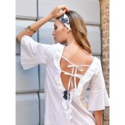 Dieses kurze Sommerkleid ist nicht bedruckt, sondern bestickt. Am Saum ist eine weiße Blumenspitze und ein blauer Fransensaum angebracht. Zusätzlich wurden rund um den Ausschnitt mehrere Blumen aufgesetzt (gehäkelt, aus Spitze und aus blauem Stoff). Dieses Kleid ist ungefüttert und kann daher als Sommerkleid, Strandkleid oder auch als gemütliche Homewear getragen werden. Im Rücken hat es einen tiefen Ausschnitt mit Schnürung und Spitzenapplikation. Die kurzen Ärmel enden halboffen und tütenförmig.