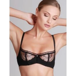Der Balconette- BH von Prelude Milano ist Spitzenwäsche Made in Europe. Das edle Teil besteht aus floraler Tüll-Spitze, weichen Samtstreifen und elastischer Microfaser. Die Cups sind unten mit Einlagen im Schnitt einer Büstenhebe abgefüttert, aber nicht komplett geschäumt und somit leicht transparent.