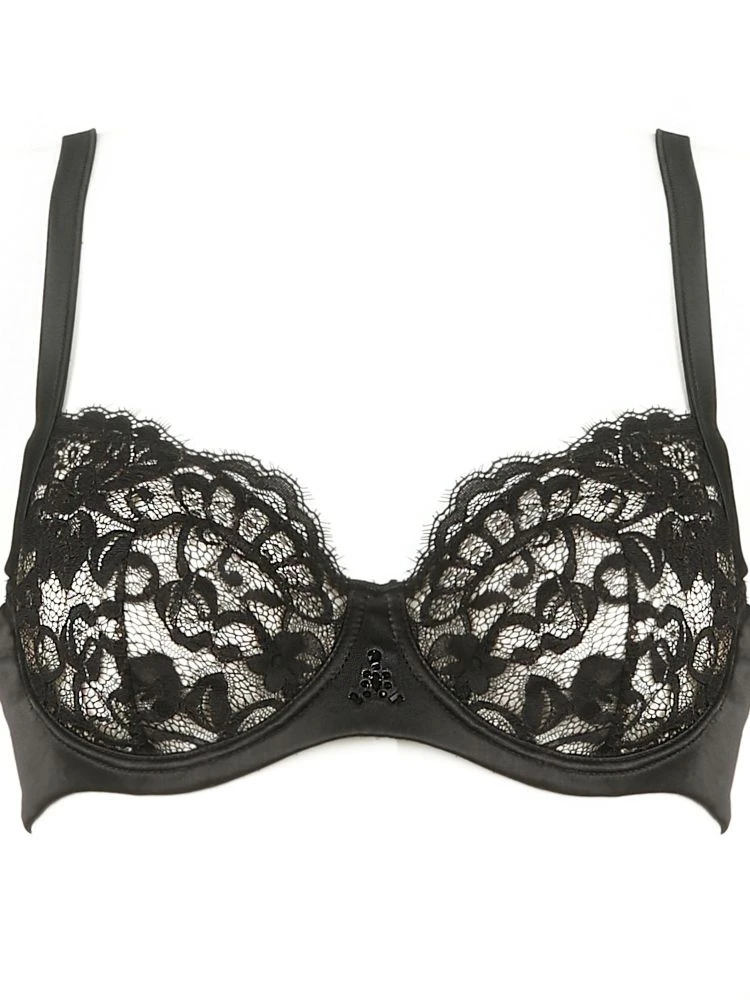 Der Bügel- BH von Prelude Milano ist Spitzenwäsche Made in Europe. Das edle Teil besteht aus glänzendem Stretchsatin und floraler Eye-Lash-Spitze. Die Cups sind innen mit Tüll gefüttert, aber nicht geschäumt und somit leicht transparent.