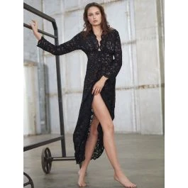Das Loungekleid Logan 74 von Pain de Sucre Suggest ist eine verführerisch kuschelige Homewear für die kühlere Jahreszeit. Das lange Loungewear Kleid besteht aus einer schmuseweichen Spitze mit Samt-Effekt. Es hat einen tiefen V-Ausschnitt, lange Ärmel und wellige Säume an Ausschnitt und unterem Saum. Das Kleid ist ungefüttert und nicht blickdicht. Sie können es aber auch als Abendkleid verwenden, wenn es mit einem Unterkleid kombiniert wird (Unterkleid ist nicht enthalten).