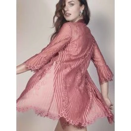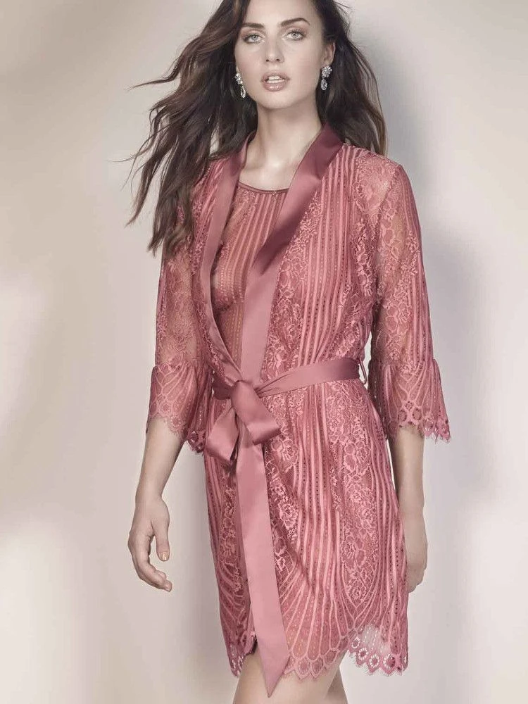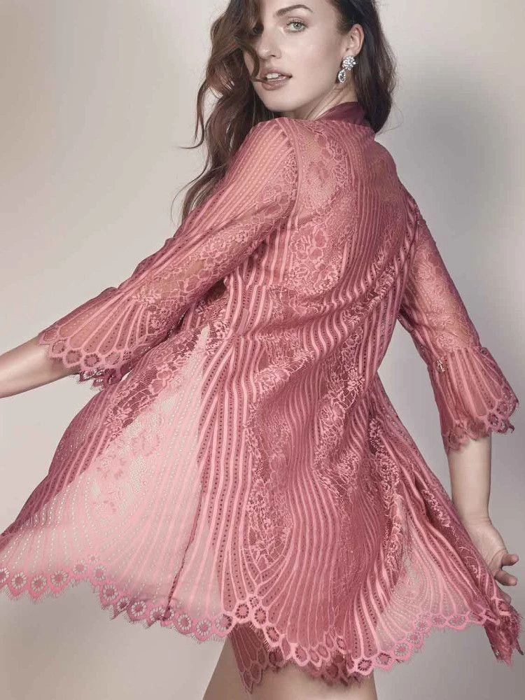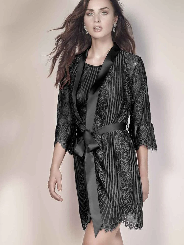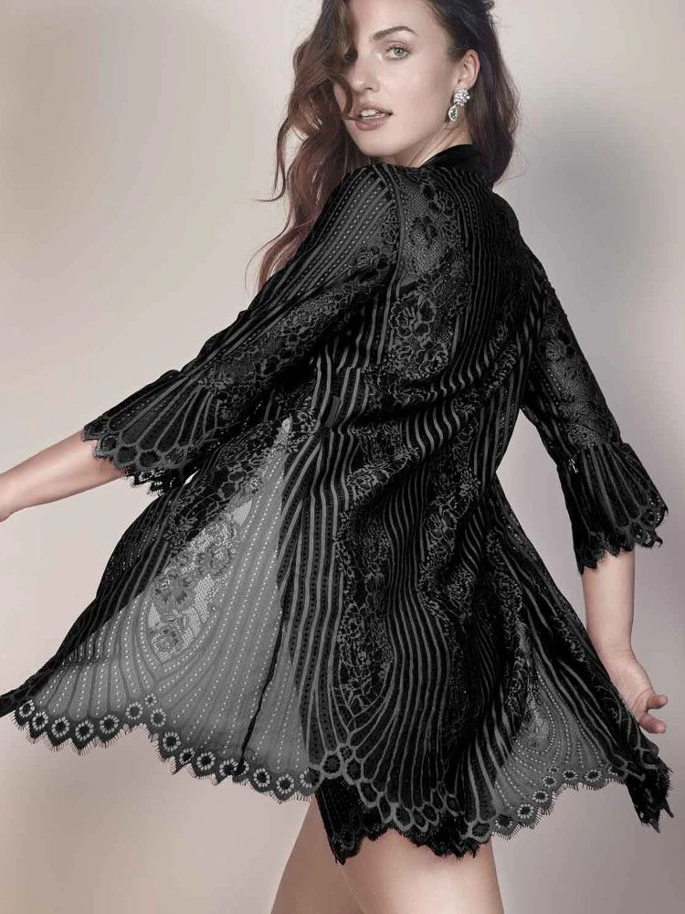 Dieser Morgenmantel ist aus Blumen Spitze gefertigt und hat 3/4-lange Ärmel. Das Revers ist mit weichem Satin eingefasst und auch der Bindegürtel besteht aus diesem Material. Dieser kurze Morgenmantel aus Spitze ist ungefüttert und daher transparent.