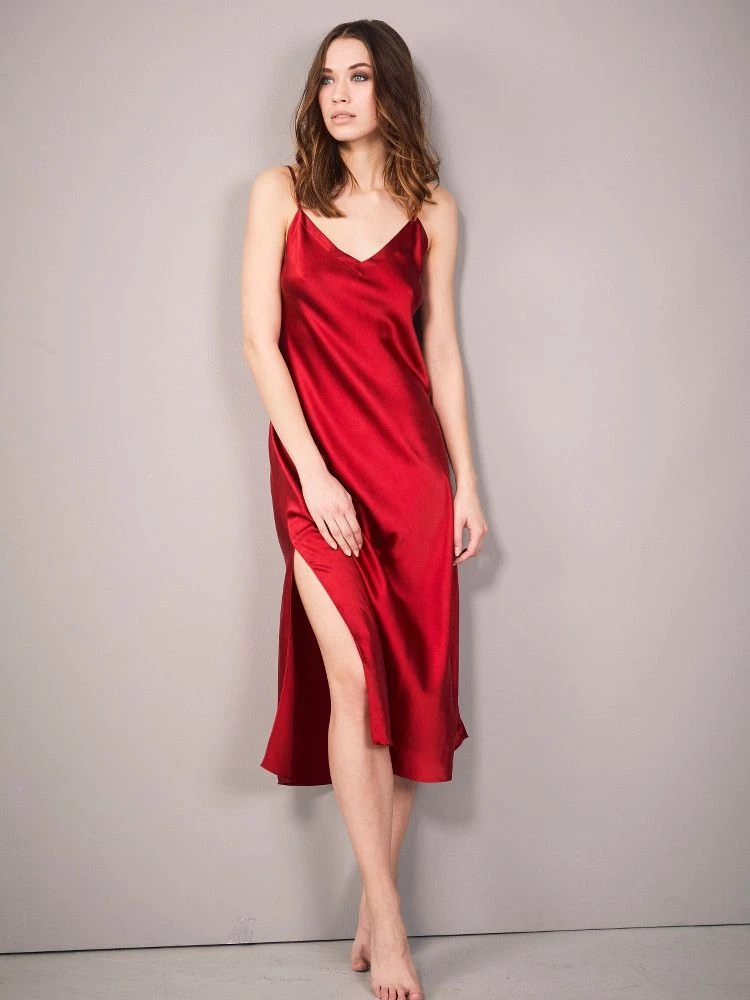 Das elegante Seiden Nachtkleid ist wie alle Teile der Eva B. Bitzer Stretch-Kollektion figurbetont geschnitten – der leicht elastische Seidensatin sorgt dabei für etwas mehr „Bewegungsfreiheit“, da das Material ein paar cm nachgibt. Das Nachtkleid hat am Saum einen seitlichen Schlitz und eine Gesamtlänge von ca. 115 cm und ist damit etwa wadenlang.