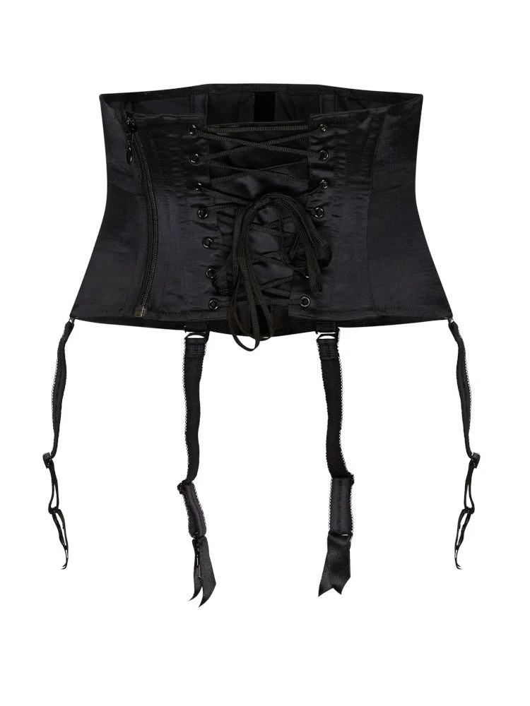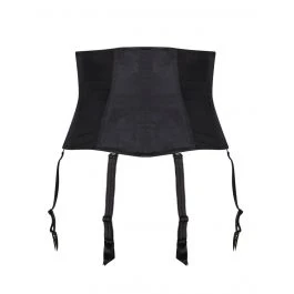 Das kurze Taillenkorsett Raja Noire von Cadolle ist eine luxuriöse Wäsche aus kräftigem Satin. Das ca. 20 cm hohe Korsett besteht aus innen abgefüttertem Satin. Es hat einen seitlichen Reißverschluss, umlaufend alle paar cm eingearbeitete Stäbchen und wird auf der Rückseite über die gesamte Länge geschnürt.