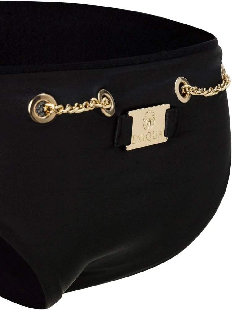 Der Triangel Bikini Lace Up Bound Black Leather ist luxuriöse Bademode von Eniqua. Die Bademode der schweizer Beachwear Marke Eniqua verführt mit besonders modischen Entwürfen und hochwertigen Materialien. Dieser hochwertige Bikini besteht aus einem weichen, schwarzen und fein glänzendem, schnell trocknendem Microfaserjersey und ist kombiniert mit goldenen Schmuckketten aus Metall im Schnürlook.