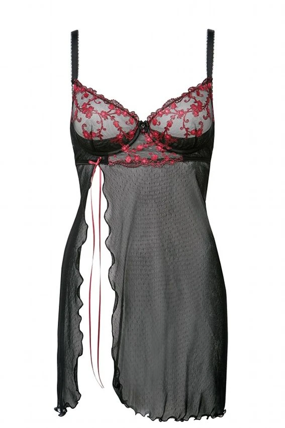 Dieses BH-Kleidchen besteht komplett aus transparentem, schwarzem Tüll und ist am Oberteil mit Blütenranken bestickt. Das Oberteil ist wie ein BH gearbeitet (mit Bügel), jedoch nur mit Tüll abgefüttert und daher transparent. Die Rückseite aus schwarzem Tüll wird mit einem dreifach verstellbaren Häkchenverschluss geschlossen.