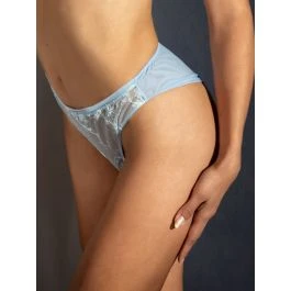 Der Slip in celeste himmelblau besteht vorne aus Tüllspitze und hinten aus doppelt gelegtem Tüll. Er hat elastische Abschlüsse und einen Innenzwickel aus Baumwolljersey. Er ist in den folgenden Größen erhältlich: