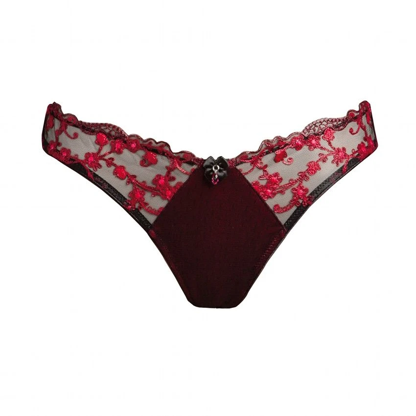 Dieser String besteht auf der Vorderseite aus schwarzem Tüll, welcher mit himbeer-rotem Stretch-Satin blickdicht hinterlegt ist. Seitlich hinten hat er Einsätze aus mit roten Blütenrankem besticktem Tüll. Die Rückseite besteht aus schwarzem elastischen Tüll. Die Vorderseite ziert ein kleines Schleifchen mit himbeer-pinkem Strass-Kristall. Der String ist in den Größen 38-44 erhältlich.