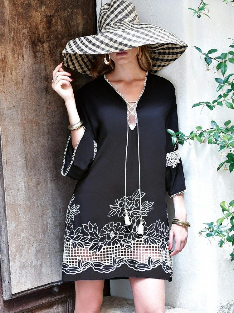 Dieses kurze Tunikakleid ist nicht bedruckt, sondern bestickt. Am Ausschnitt und den Ärmelenden ist eine feine Mäusezahn-Borte in Kontrastfarbe angebracht und das Kleid fällt in A-Linie. Zusätzlich haben die Ärmel Einsätze aus Blumenspitze und der V-förmige Ausschnitt wird mit einem Bindebändchen gestaltet. Dieses Kleid ist ungefüttert und kann daher als Sommerkleid, Strandkleid oder auch als gemütliche Homewear getragen werden.